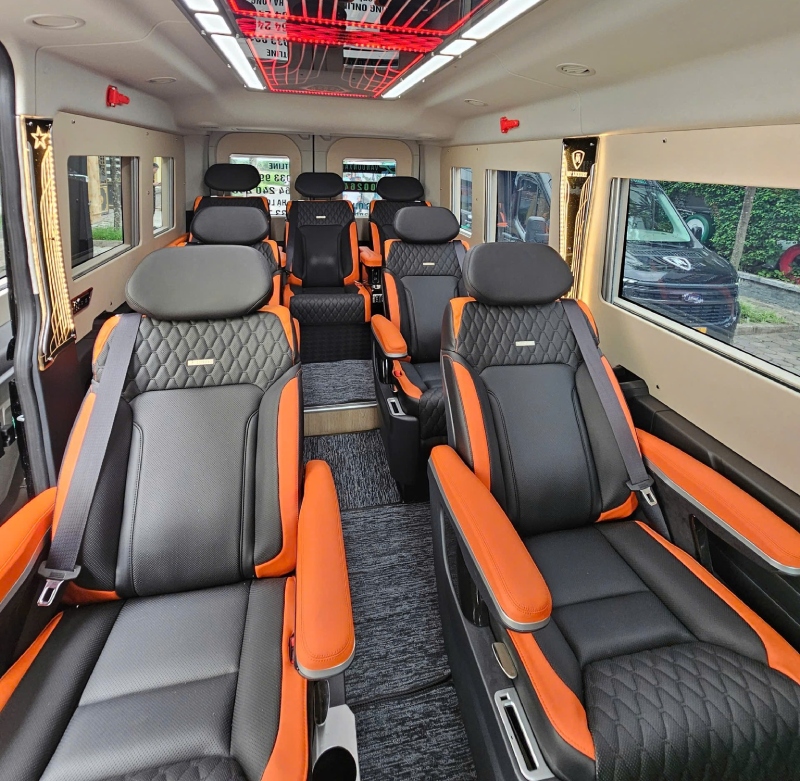 Dòng xe limousine của Vân Đồn Xanh được thiết kế với 9 ghế ngồi dựa trên khung xe 16 chỗ, mang lại không gian rộng rãi và thoải mái cho hành khách. Nội thất trong xe sử dụng ghế bọc da cao cấp, êm ái cùng nhiều tiện ích như ổ cắm sạc USB, wifi 4G và hệ thống điều hòa hiện đại, giúp hành trình di chuyển trở nên dễ chịu hơn.